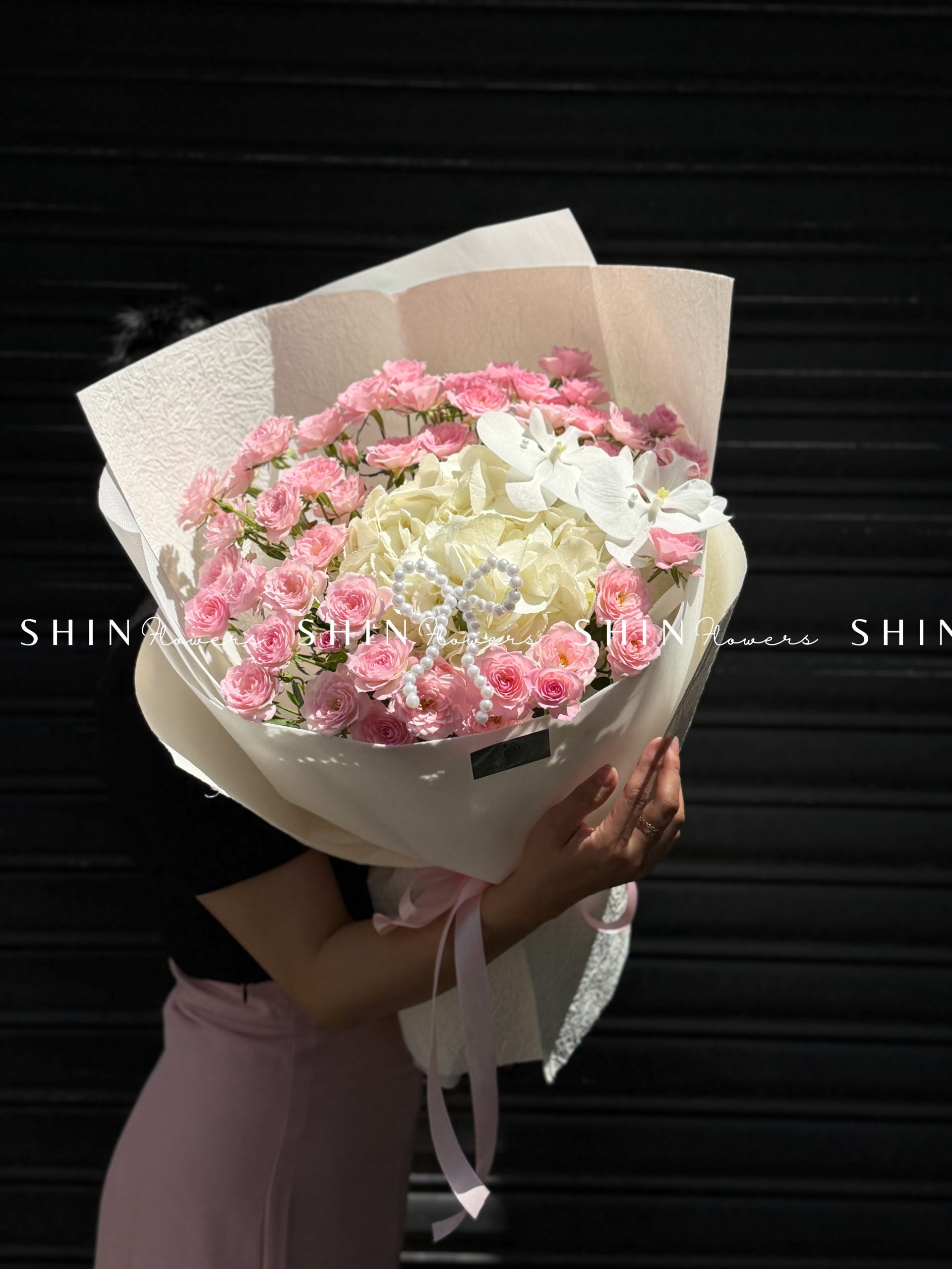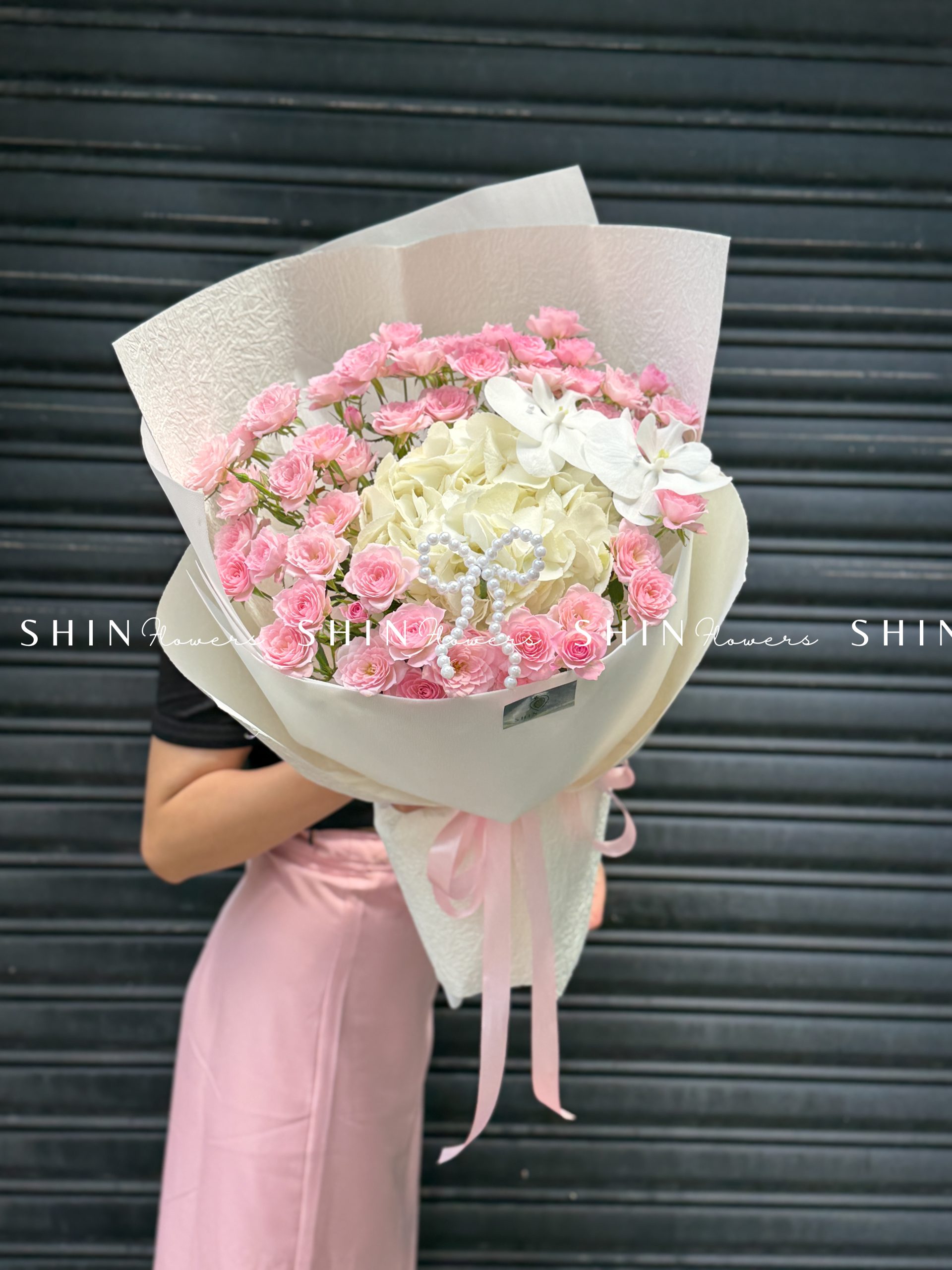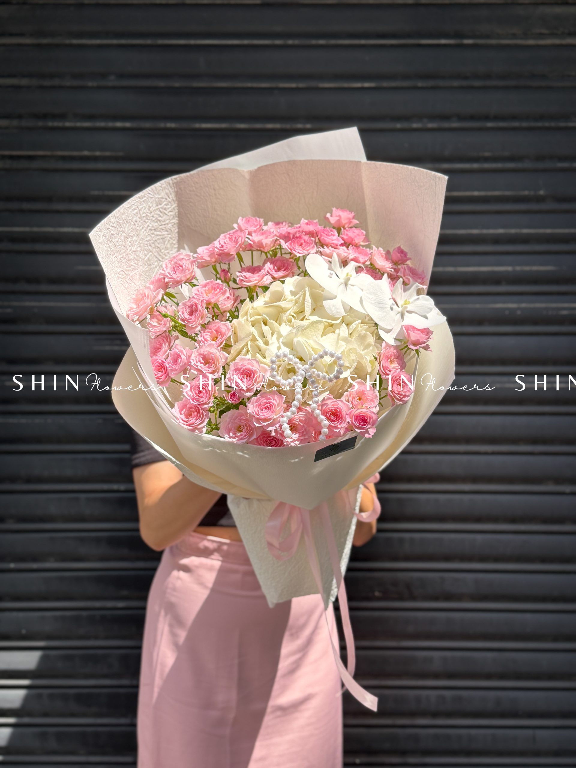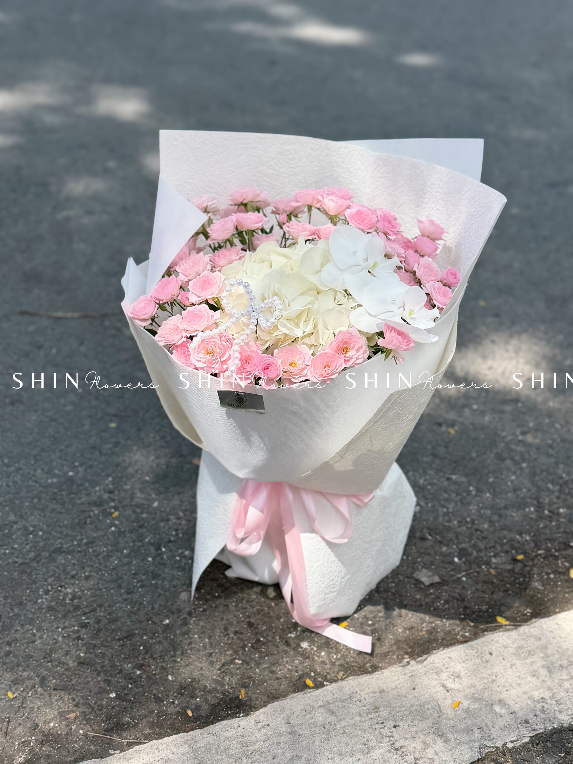 Bó Hoa Hồng Chùm Điền Mật mix Tú Cầu Trắng S551