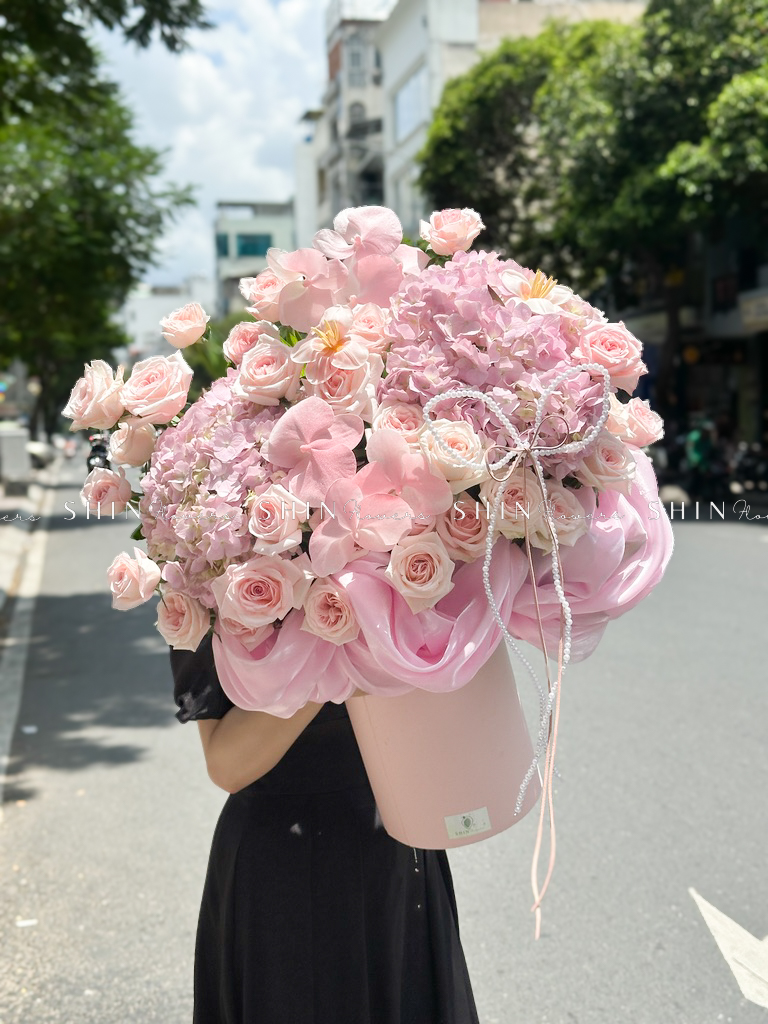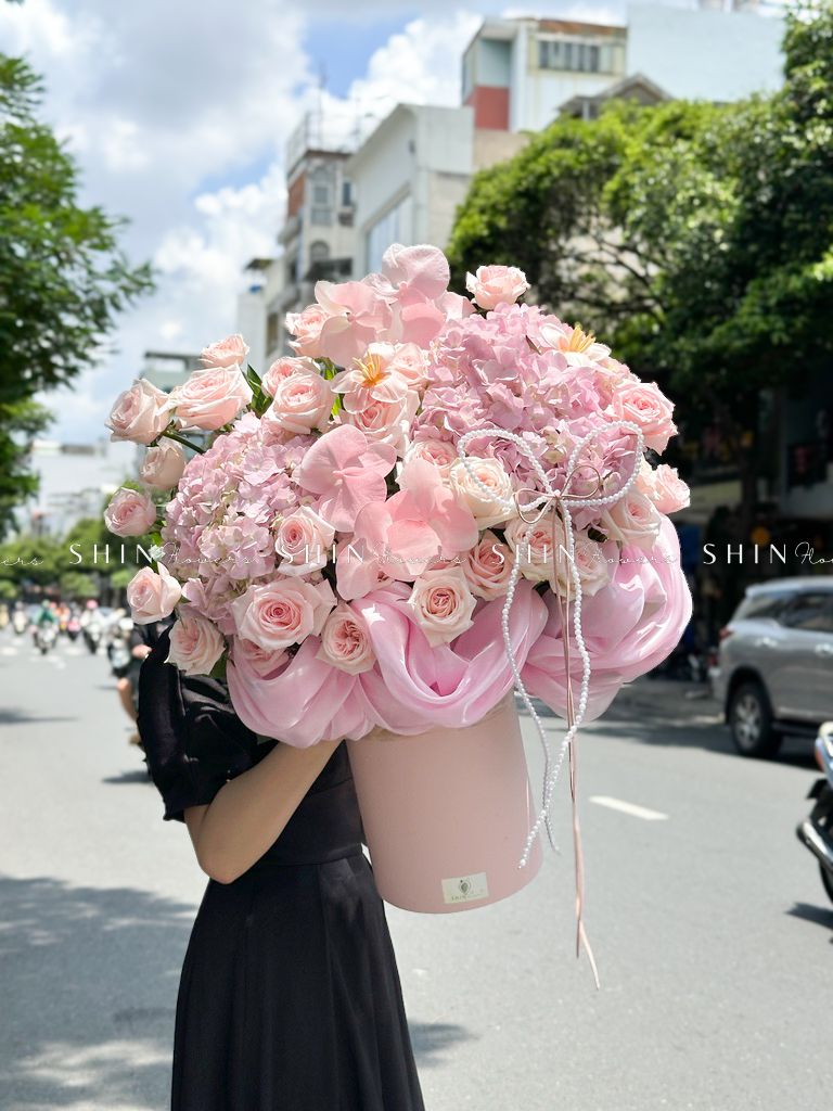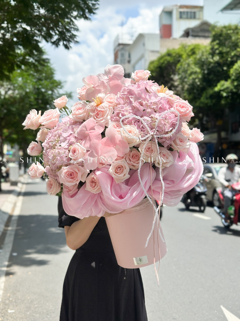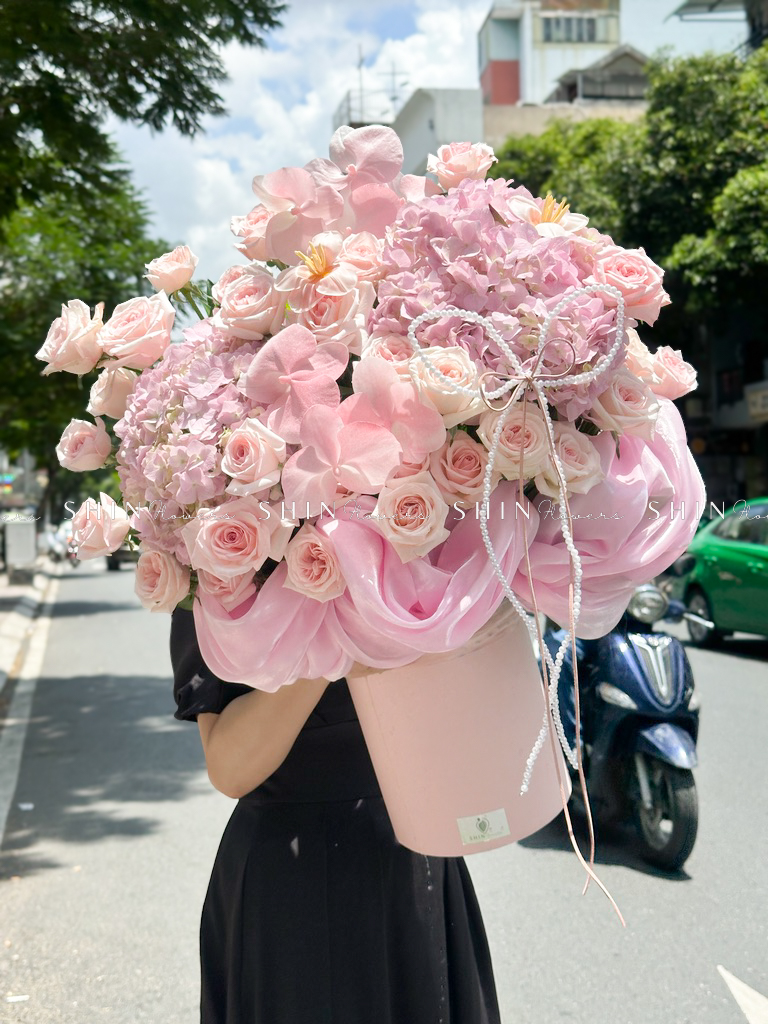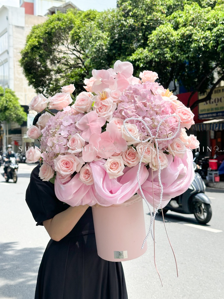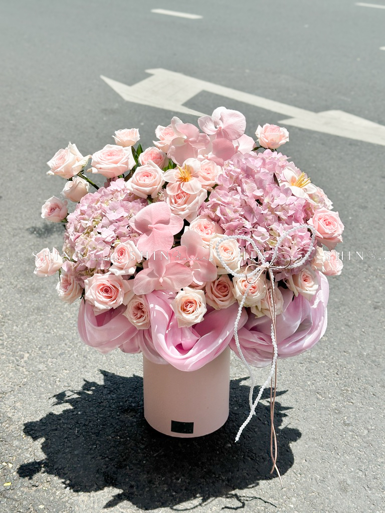 Hộp hoa Cẩm Tú Cầu Hồng mix Lan Hồ Điệp H110