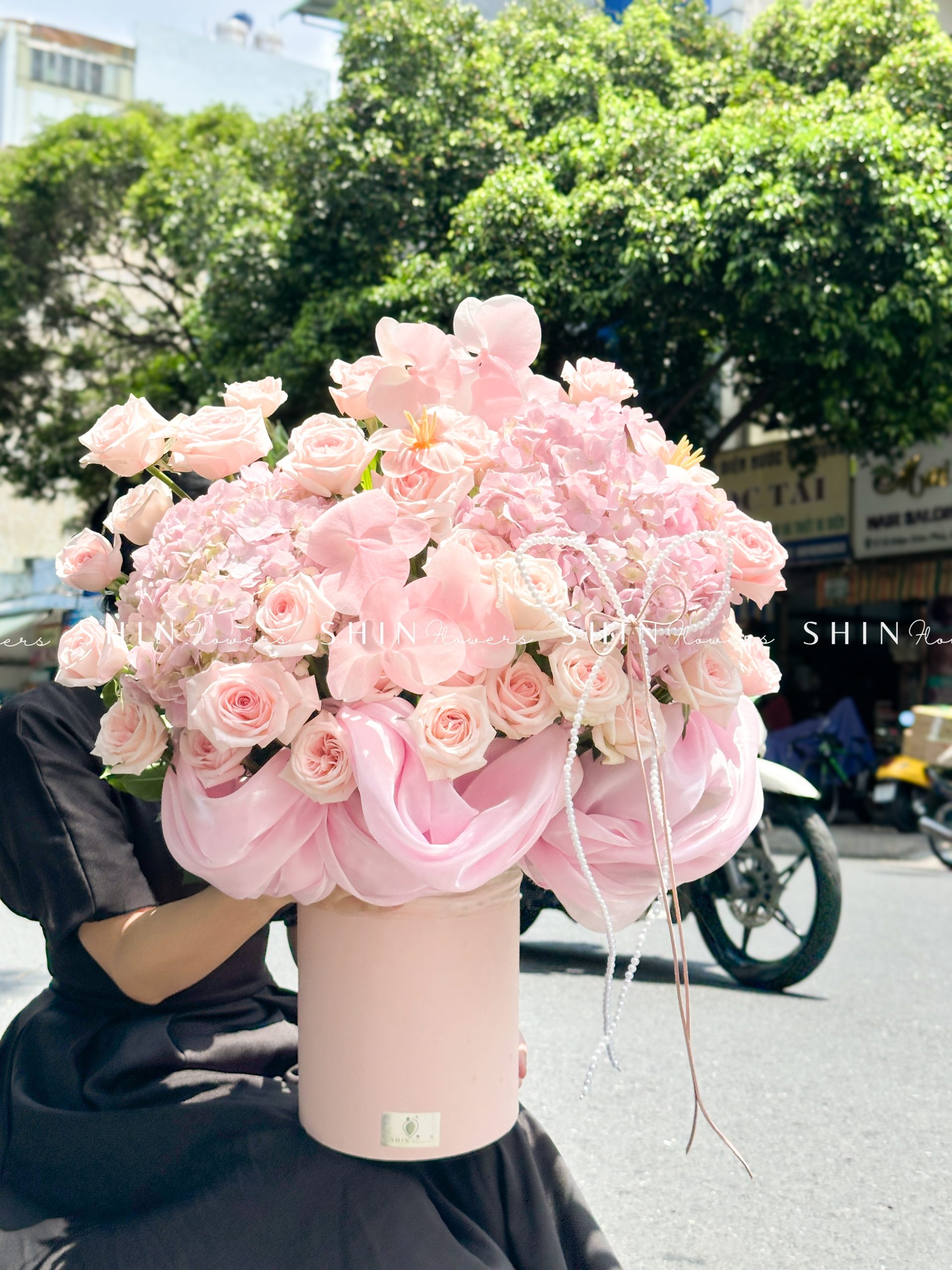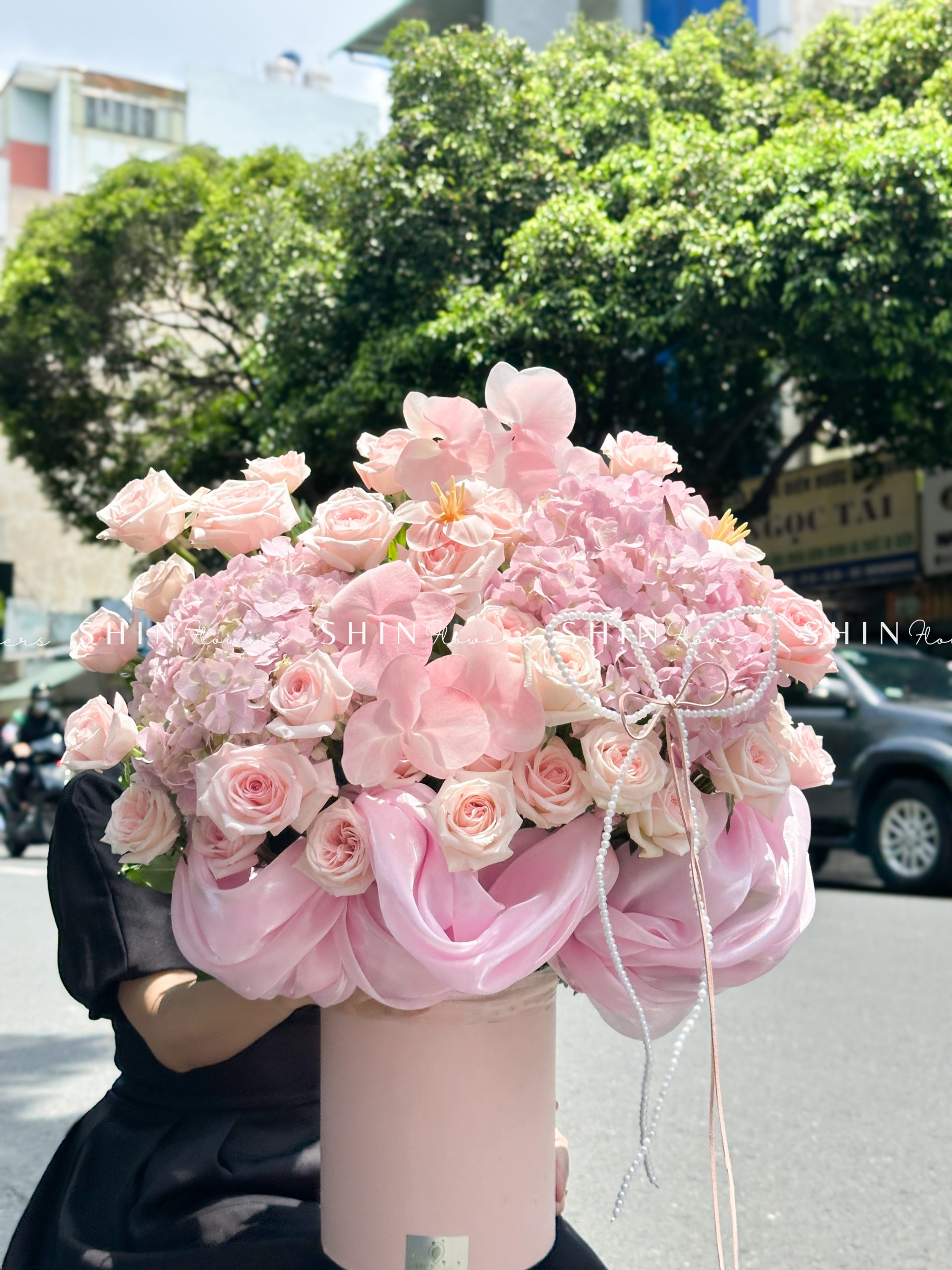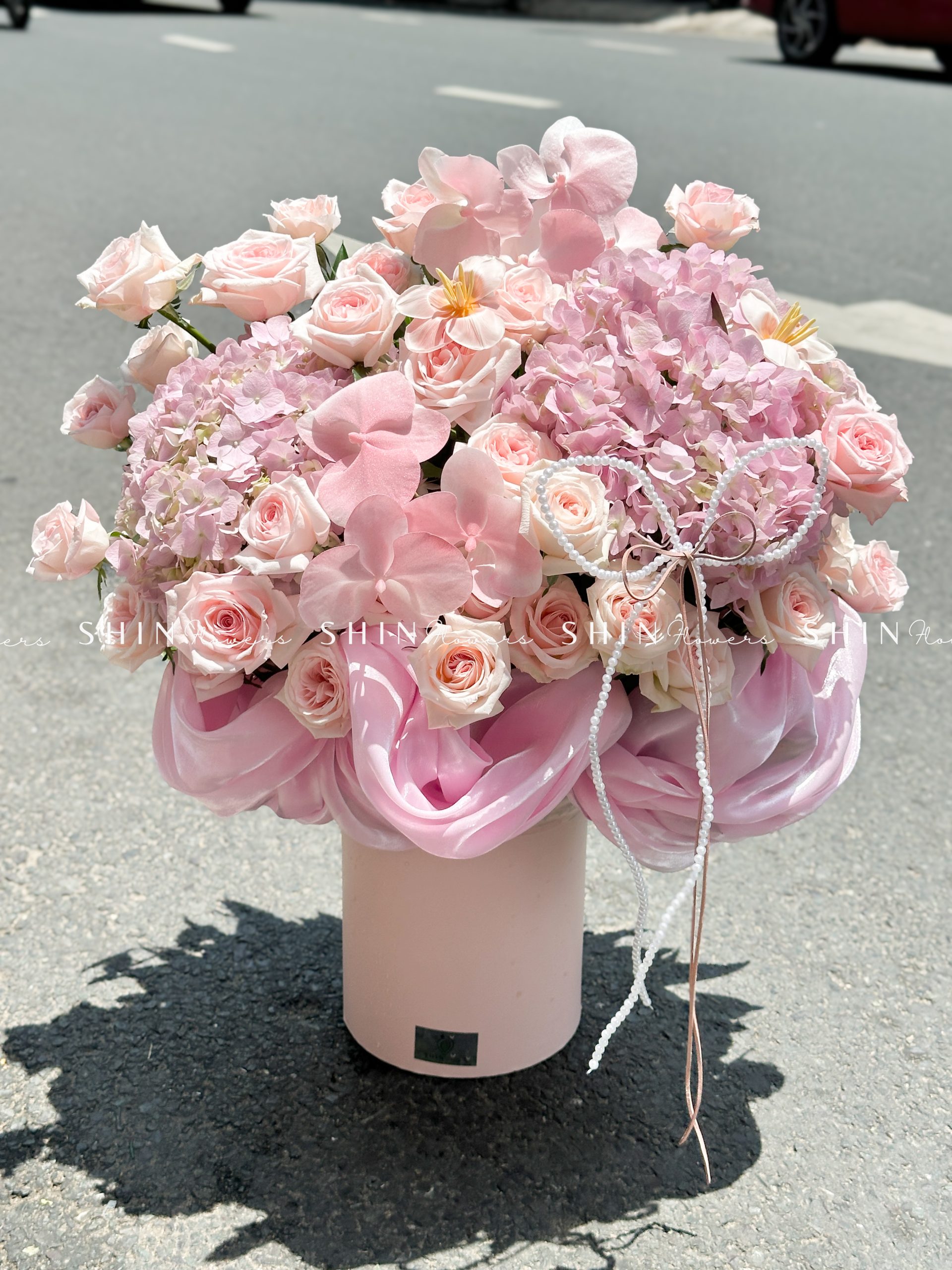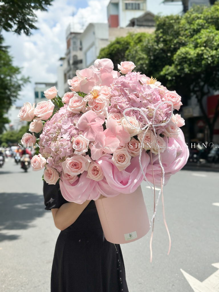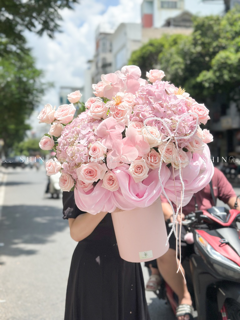 Hộp hoa Cẩm Tú Cầu Hồng mix Lan Hồ Điệp H110