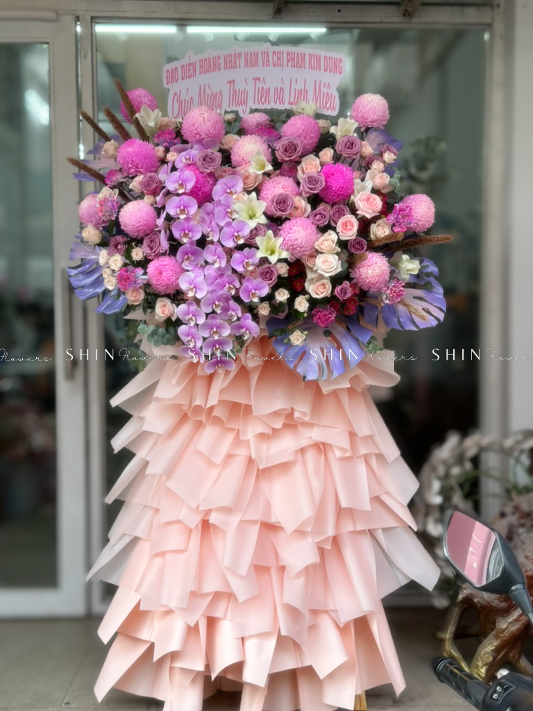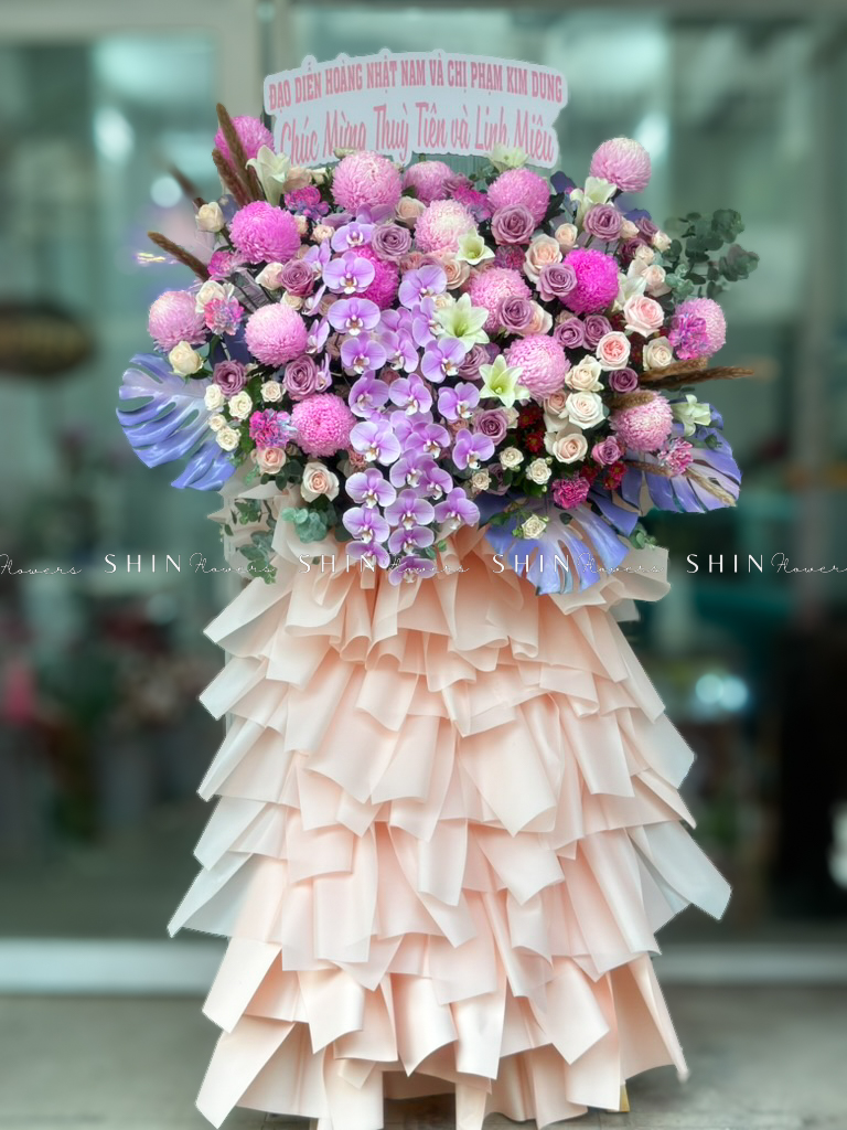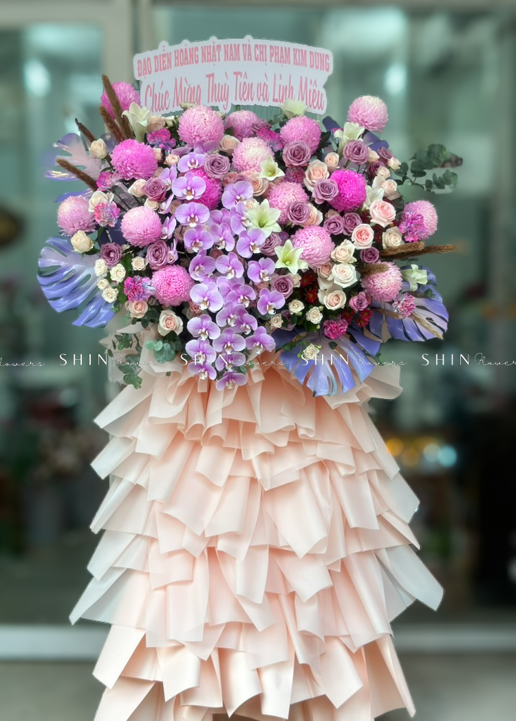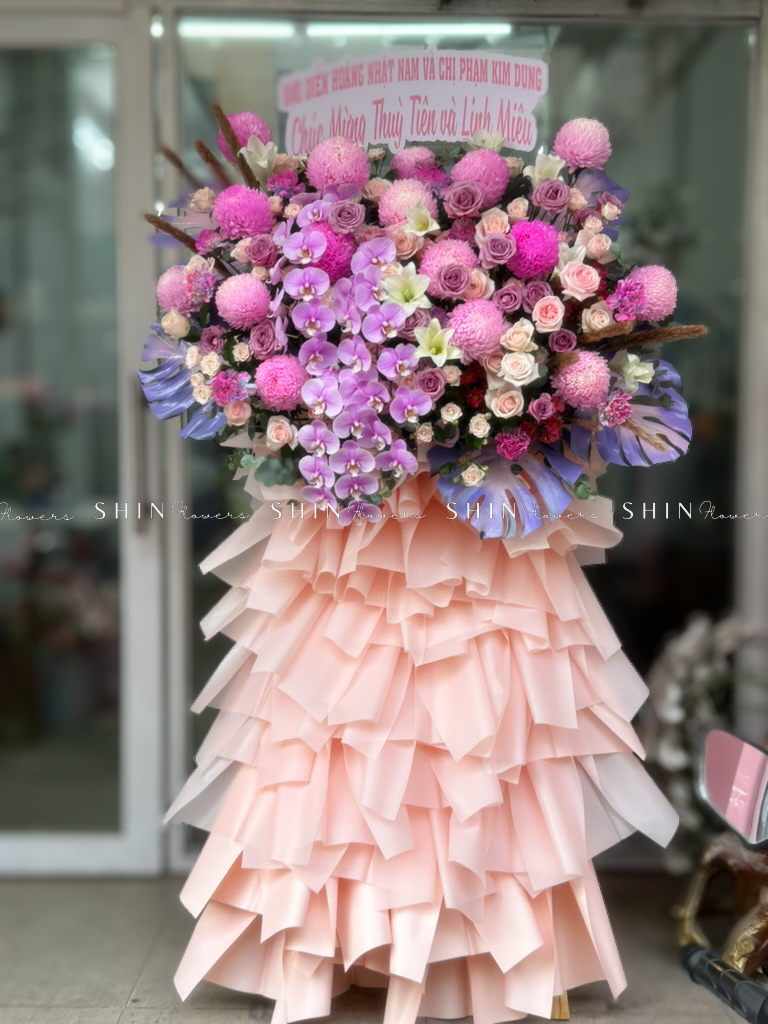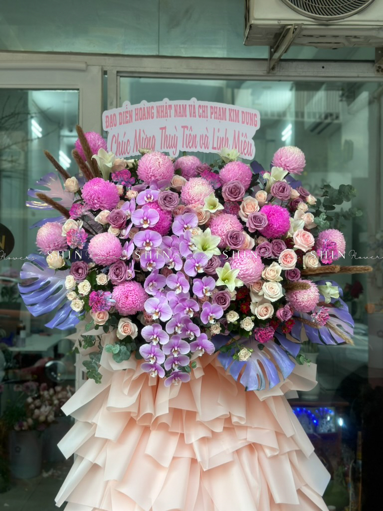 Kệ Hoa Khai Trương Hoa Cúc Mẫu Đơn Tone Hồng Tím cao 2m K05