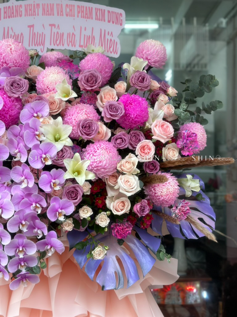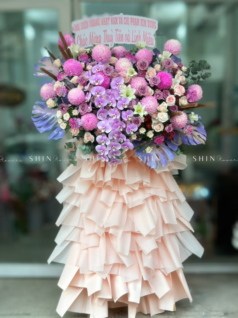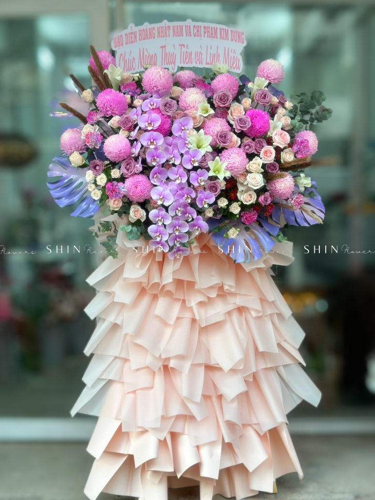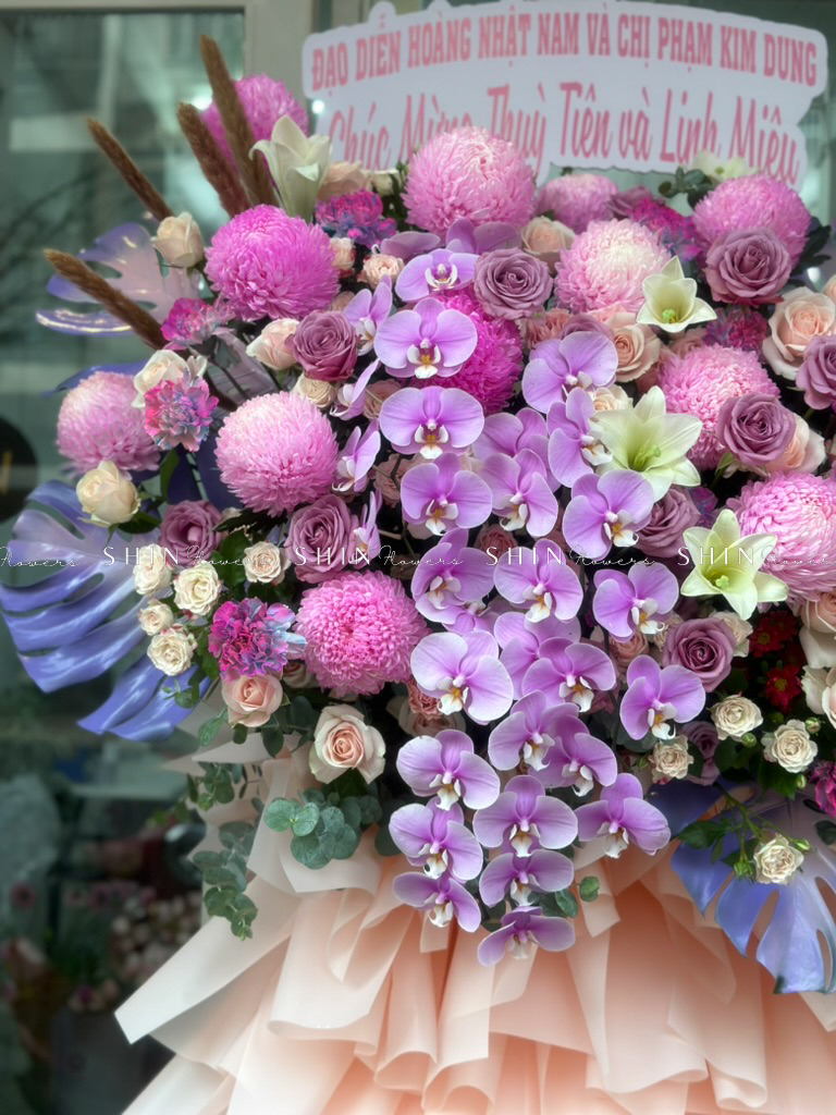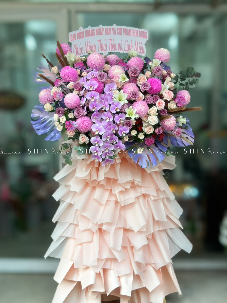 Kệ Hoa Khai Trương Hoa Cúc Mẫu Đơn Tone Hồng Tím cao 2m K05